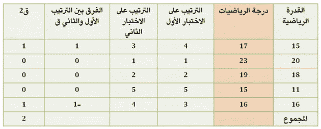 والعمود الثالث نضع الترتيب على الاختبار الأول، العمود الرابع نضع الترتيب على الاختبار الثاني، العمود الخامس نضع الفرق بين الترتيب الأول والثاني (ق).