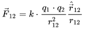 و” “: متجه الوحدة وقيمته تساوي واحد واتجاهه من الشحنة الأولى إلى الشحنة الثانية، و” “: مربع المسافة بين الشحنتين بالمتر المربع.