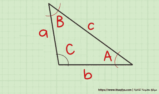 لنفترض أن هناك مثلث أمامنا، وقمنا بتعيين أحرف متغيرة لمكوناته، حيث يجب أن يتم تسمية الجانب الأول الذي تعرفه بـ “a”.