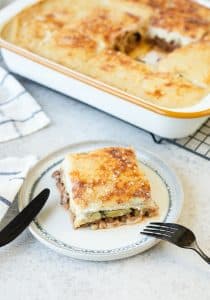 - ثم يتم وضع القليل من البشاميل مرة أخرى، ويتم إضافة اللحمة المفرومة.
