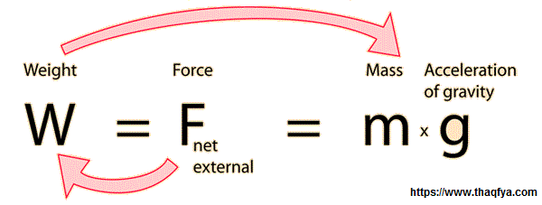 كما أن الوزن (W) يساوي القوة (F)، إذا كان الجسم في حالة سقوط حر مع عدم وجود قوة أخرى غير الجاذبية.