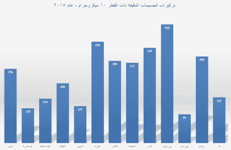وفيما يلي نقدم إحصائية بيانية عن معدل التلوث في الهواء الناتج عن التفاعلات الكيميائية في عدد من محافظات مصر مقدرة ب وحدة ميكروجرام من الملوثات في كل متر مكعب من الهواء الجوي.