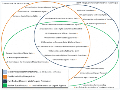 تتكون المظلات المختلفة من المحاكم والهيئات الرقابية لأنظمة حقوق الإنسان العالمية، والإقليمية التالية: